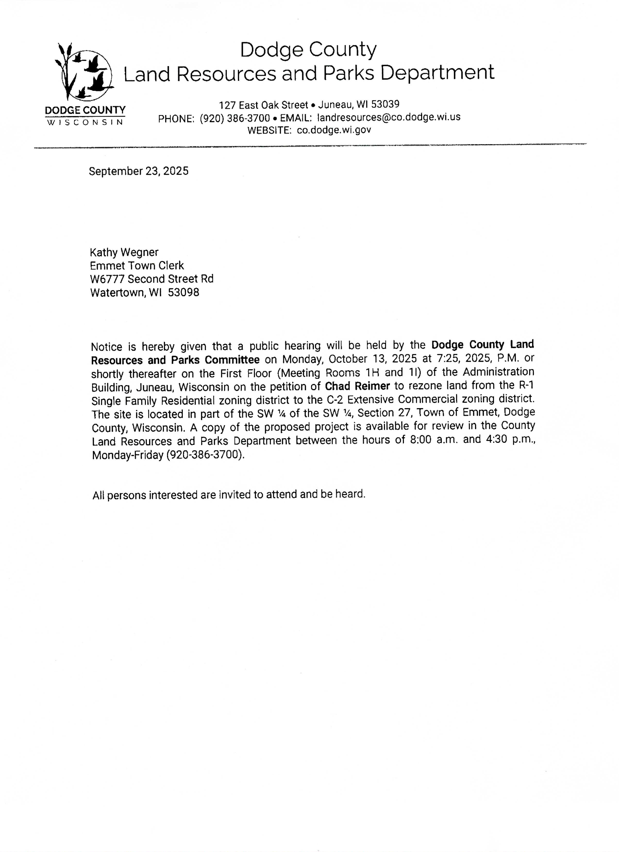 Public information meeting and open house on the 2045 Dodge County Comprehensive Plan Update, on October 21, 2025, at 5:00pm – 7:00pm. The informational meeting and open house will be held at the Dodge County’s Clearview Facility, 1st Floor Conference Room, 198 County Road DF, Juneau, Wisconsin. Notice posted below